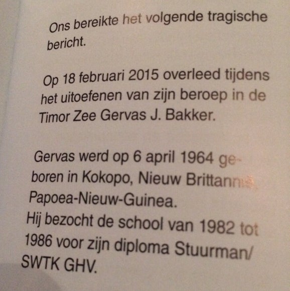 Via de Conelis Douwes van september 2015 bereikte ons het tragische nieuws dat Gervas Bakker op 18 februari 2015 is overleden... We hebben in 2014 via de e-mail nog contact gehad met Gervas, hij wilde dolgraag naar de reünie komen maar zat in november op zee. We wensen de nabestaande alsnog via deze weg alle sterkte toe.....
