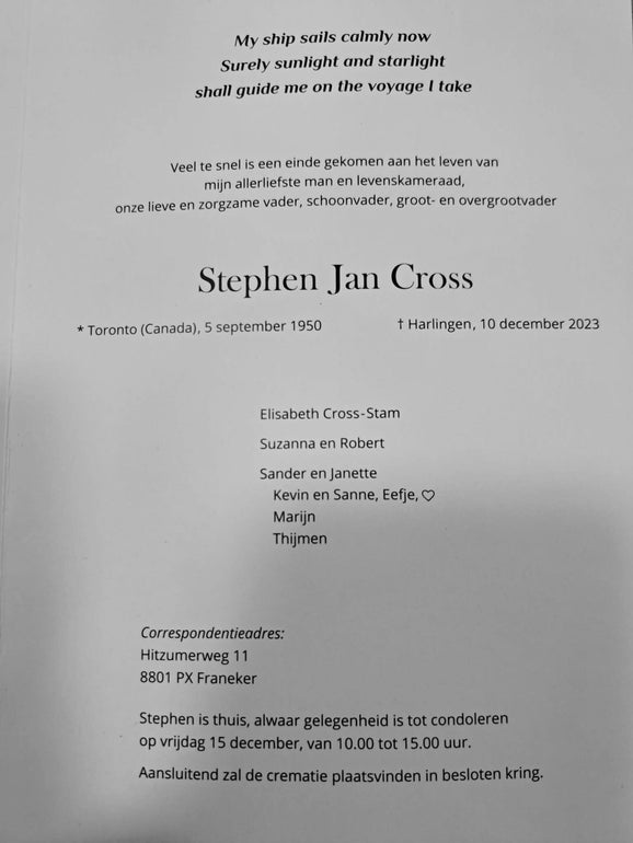 Ons bereikte via VOZT Scheepspraat het trieste bericht van het overlijden van onze oud leraar dhr. Stephen Cross. Stephen was gedurende 10 jaar directeur van het MIWB en vanaf 2010 tot voor kort bestuurslid van de VOZT.